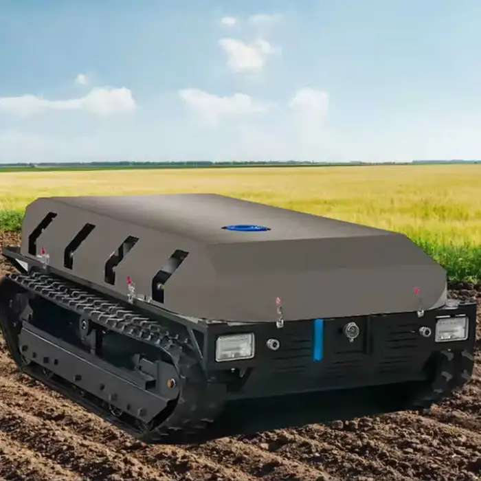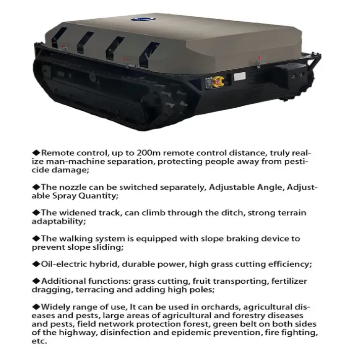 It is a remote-controlled, unmanned crawler sprayer designed for agricultural spraying tasks. With a 300L tank capacity and force-feed spraying system, it is built for orchards and large fields to apply pesticides, fertilizers and water efficiently.