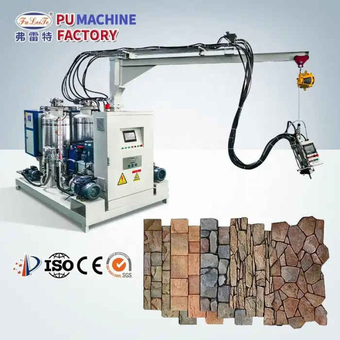 The machine is designed to produce rigid polyurethane foam, which can be used for creating PU stone skins, mushroom stones, custom cultural stone products, and for construction and design projects.