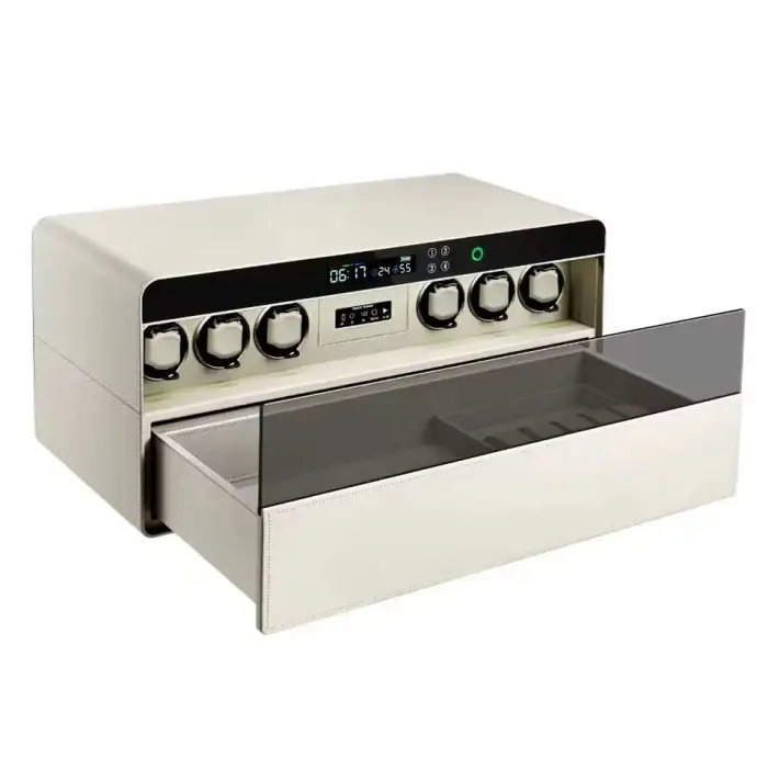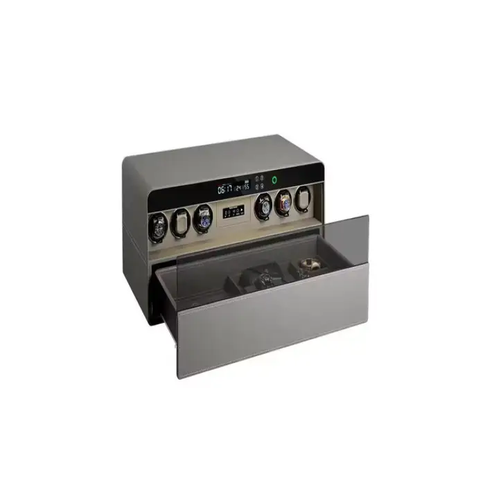 The watch winder features a triple damper track slider type, which helps in smooth operation.
