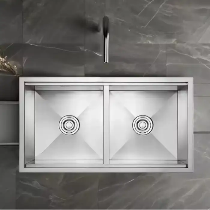 This sink is designed in a double bowl style, providing versatility in kitchen tasks.