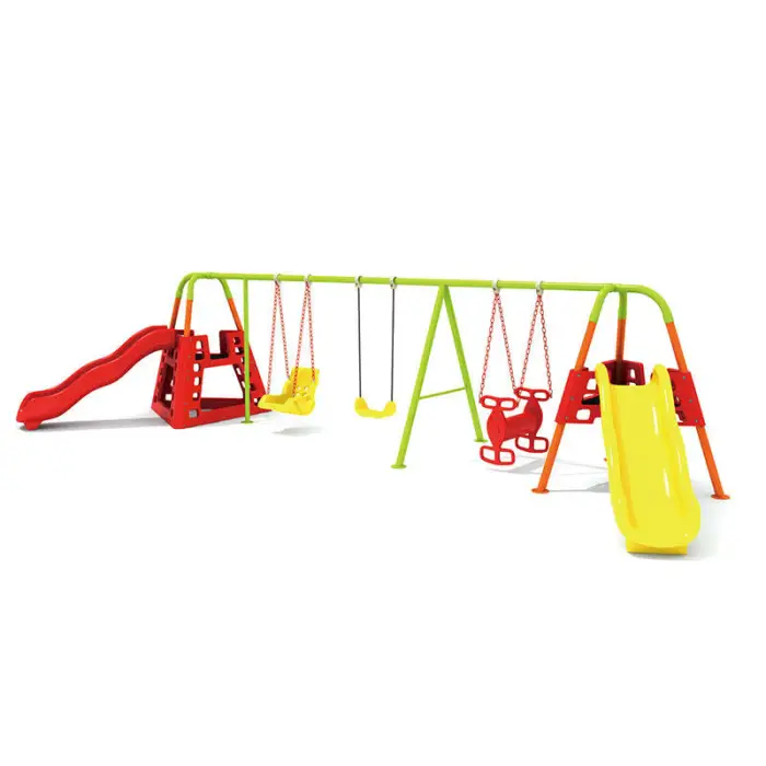 The slide swing set is made from galvanized pipe and durable plastic, ensuring safety and longevity.