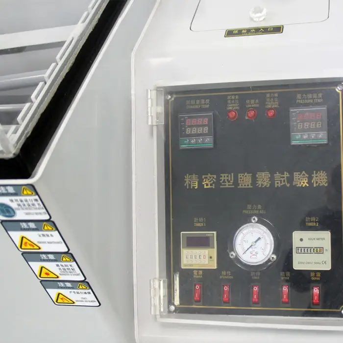 The machine meets industry standards including ISO-9227 and ASTM-B117, which are essential for coating durability testing.