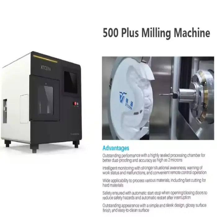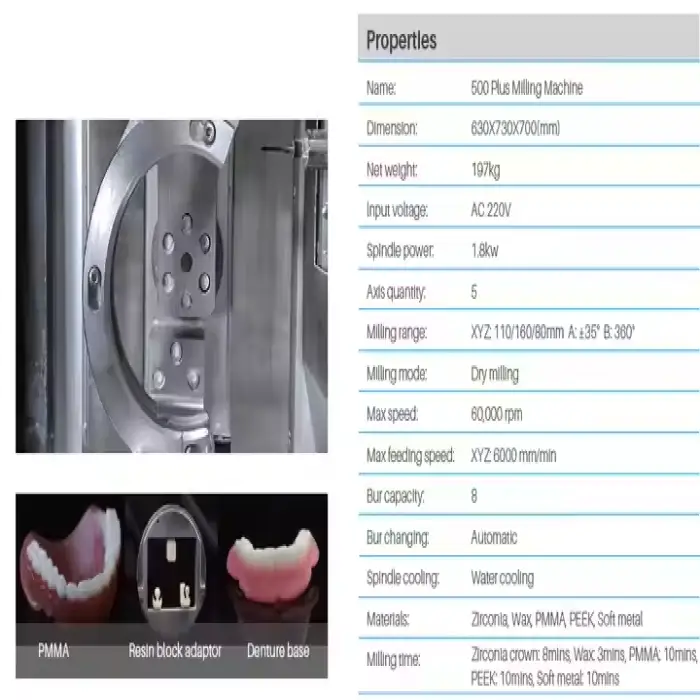The machine is capable of milling various materials, including lithium disilicate and zirconia, which are commonly used in dental restorations.