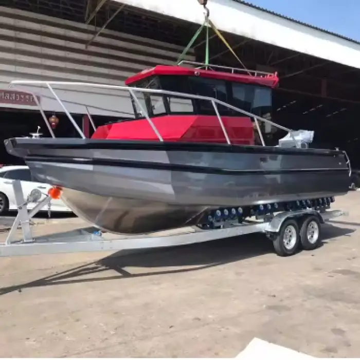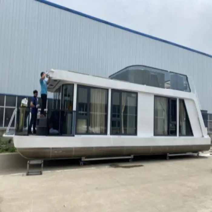 The houseboat is constructed from high-quality marine-grade aluminum, ensuring durability and lightweight performance.