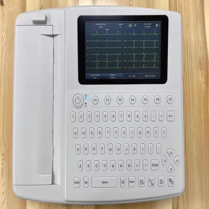 The product description does not list specific data export or printing capabilities. Many clinical 12-lead ECG machines offer options to print reports and export data via USB or networked software. For precise data management features and compatible formats, request the detailed specifications or ask the supplier.