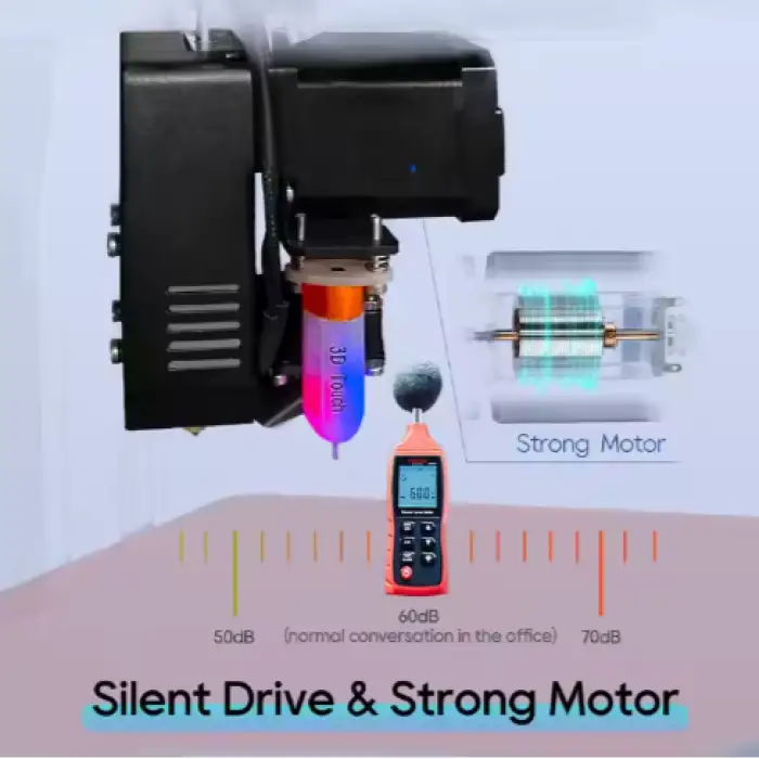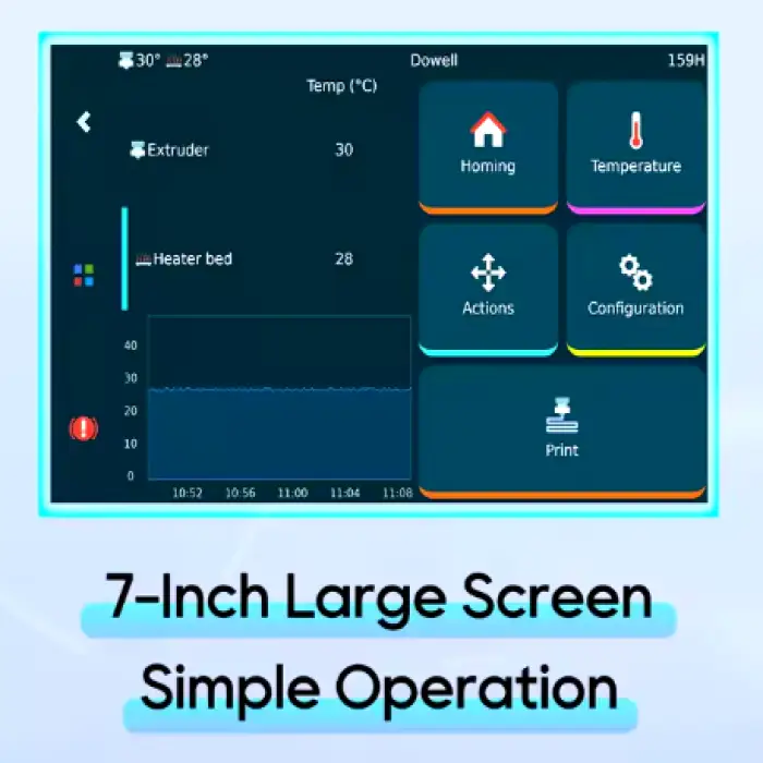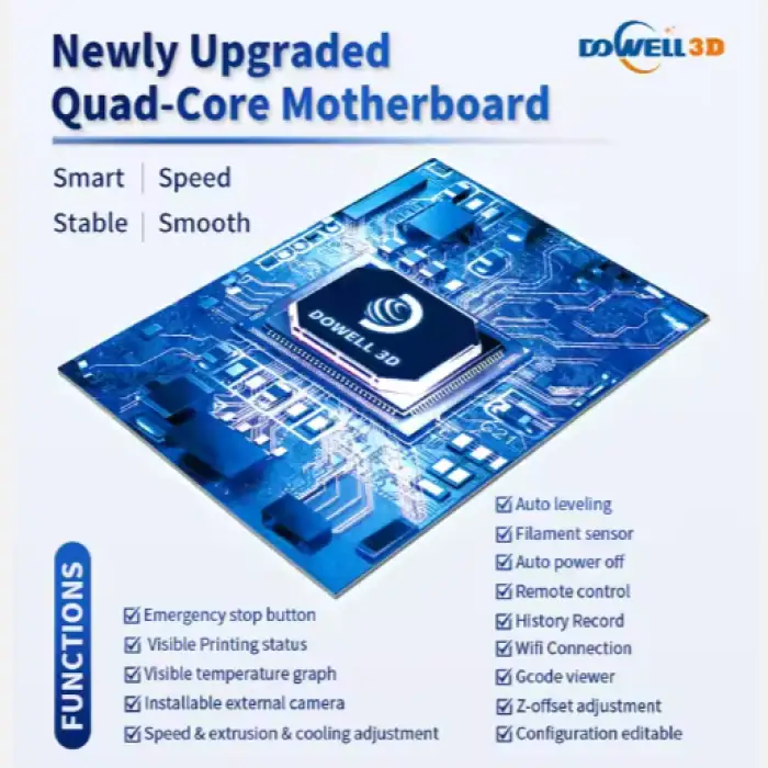The printer works seamlessly with Cura and Dowell software and supports file formats such as G-Code, .obj, and .STL.