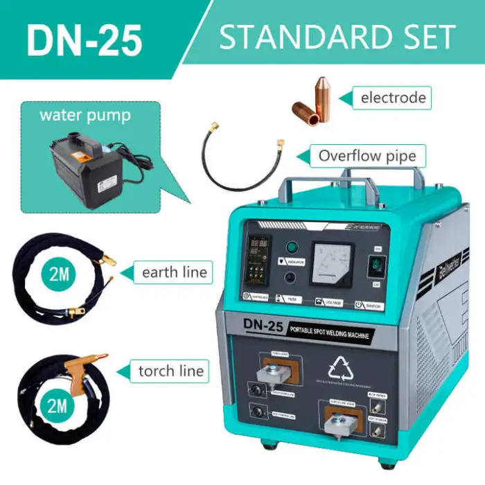 The DNJ-25 can weld various materials including carbon steel, metal, iron, and brass.