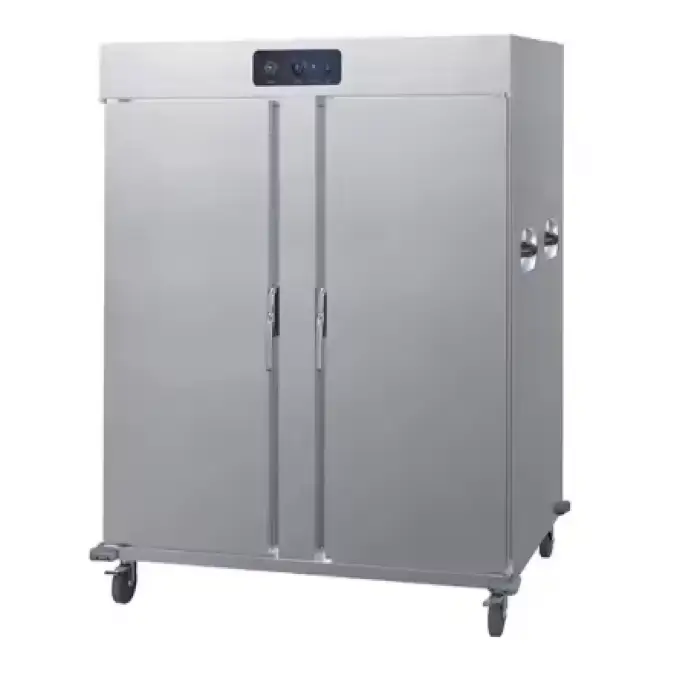 It is an electric double-door food warming trolley designed to keep prepared meals hot and ready for serving in restaurants, hotels, catering operations, bakeries and events.
