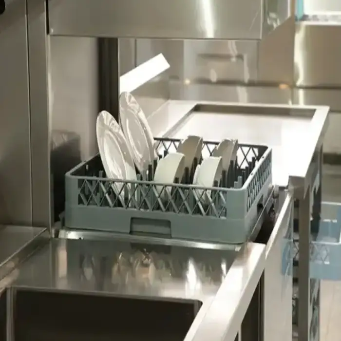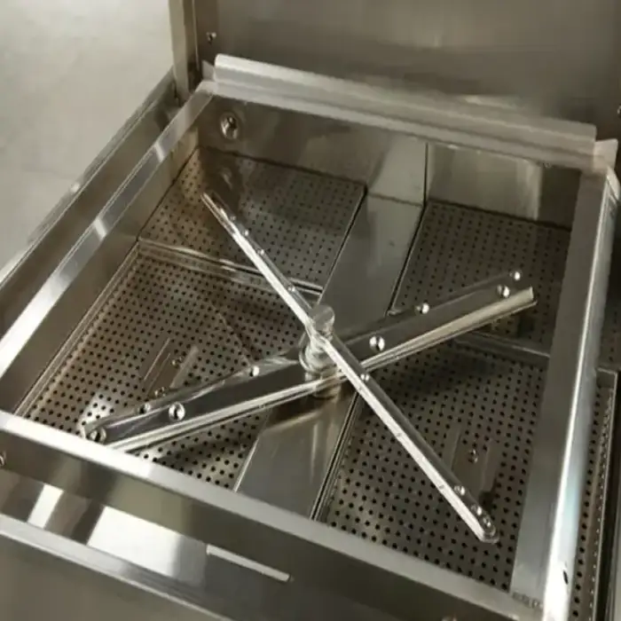 The dishwasher features simple controls that make operation straightforward, allowing staff to quickly and efficiently manage dishwashing tasks.
