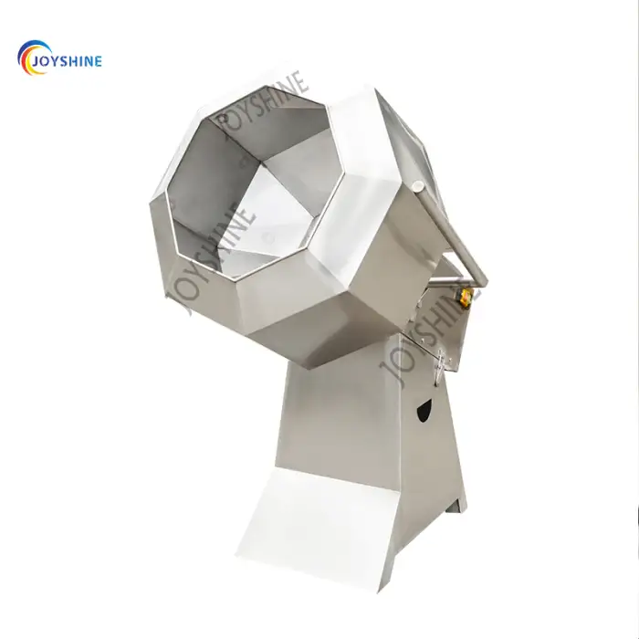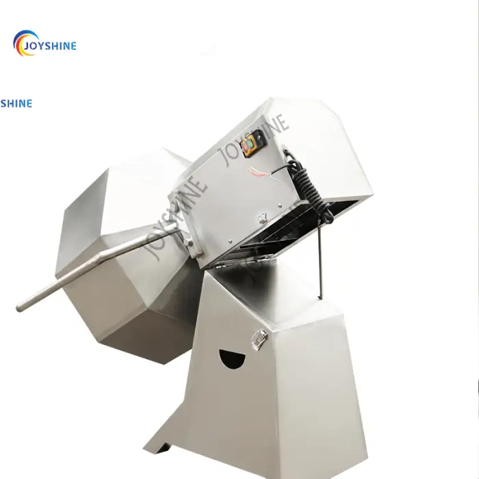 The machine features an octagonal design and a vibration motor, which help in scattering the seasoning powder evenly and fully mixing it with the food.