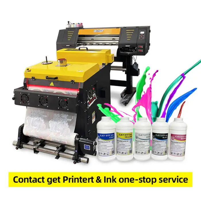 This printer uses DTF ink in CMYK + White colors.