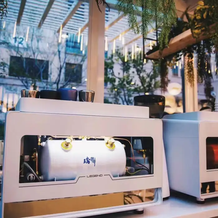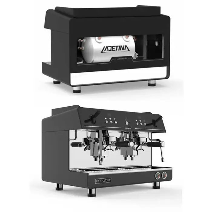 The machine features a body made of galvanized sheet painting and mirror stainless steel, with a high-quality copper boiler for effective heating.