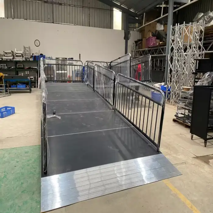 The ramp size is 1 x 2 m. To ensure a safe incline, measure your stage height and calculate the slope relative to ramp length. Follow local accessibility guidelines (for example, ADA recommends a 1:12 slope for permanent ramps) and consult the seller if you need a different length or configuration.