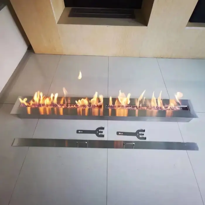 The fireplace features a stainless steel panel, ensuring durability and a modern aesthetic.