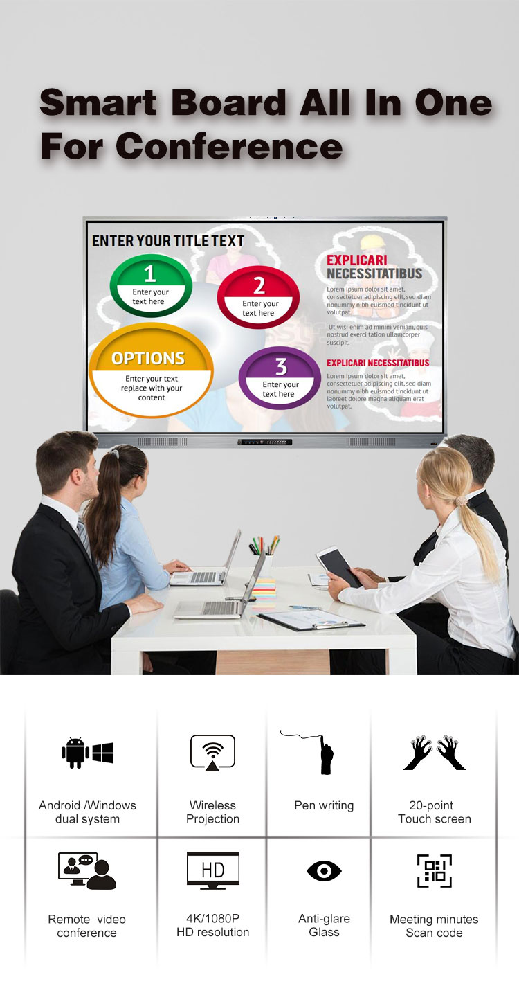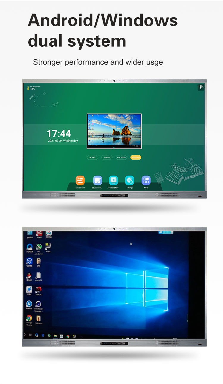 The EIBOARD supports dual operating systems—Windows 7 (English) and Android, allowing versatile functionality.