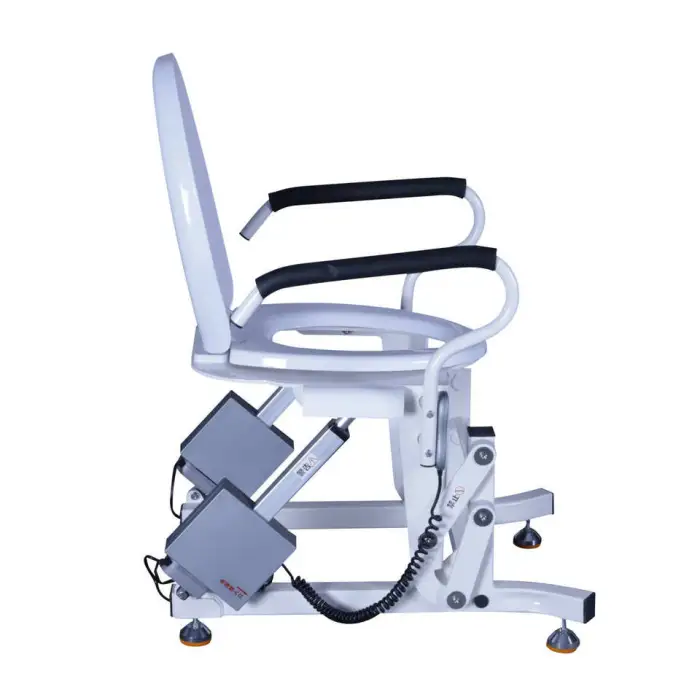 The electric lift mechanism operates smoothly with a simple control, allowing users to raise and lower the seat effortlessly.