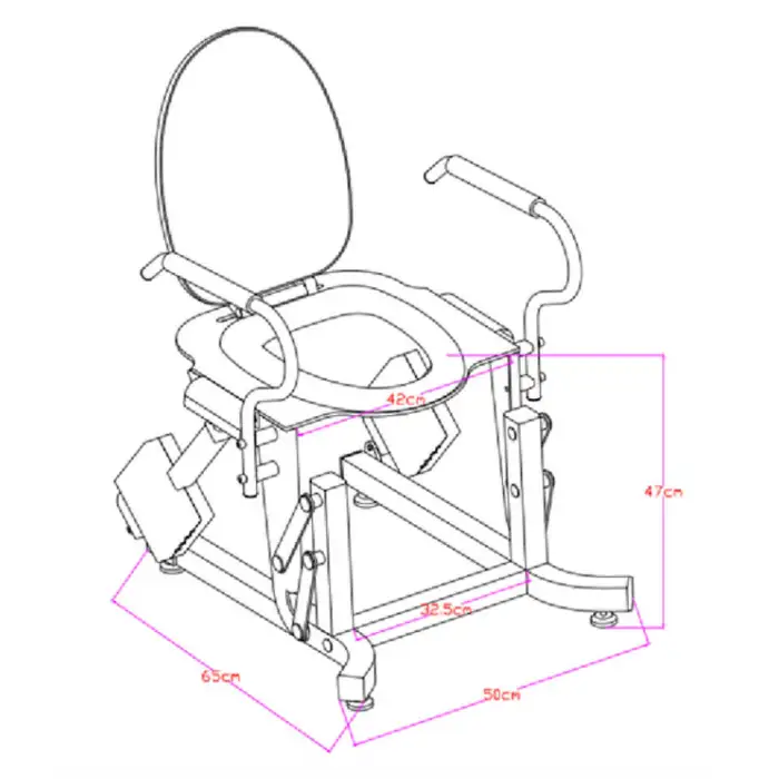 The dimensions of the toilet lift seat are 75 cm in length, 54 cm in width, and 43 cm in height.