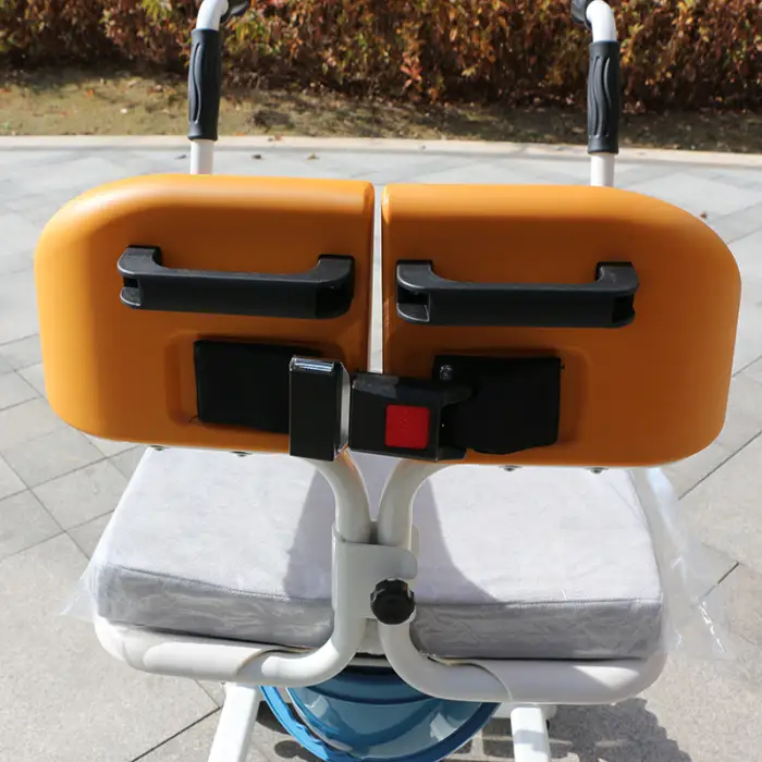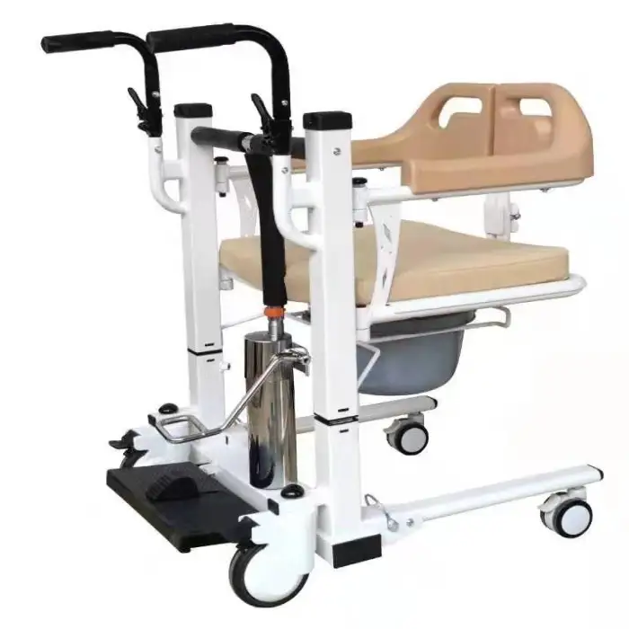 A folding mobile bathroom chair and patient transfer wheelchair designed for home and hospital use. It features a sturdy steel frame, detachable commode, and is built to make bathroom transfers safer and easier for caregivers and patients.