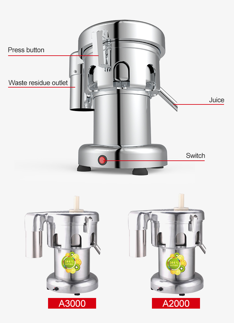 The Electric Juicer Machine - Model A3000 includes safety features such as an overload protection switch to prevent motor damage.