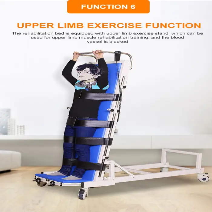 It is an electric standing bed intended for rehabilitation and training of disabled people, suitable for rehabilitation centers, hospitals, clinics, nursing homes, home care, and physical therapy sessions.