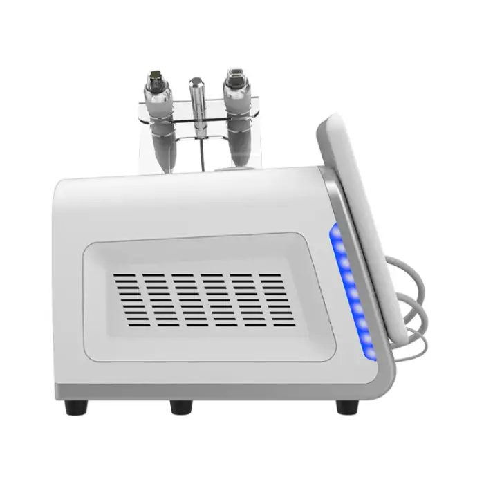 Turn off and unplug before cleaning. Wipe handpieces and main unit exterior with a soft cloth dampened with recommended disinfectant; avoid immersing in liquid. Use single‑use or sterilized needle cartridges for microneedling. Inspect cables and connectors regularly and store in a dry, cool place.
