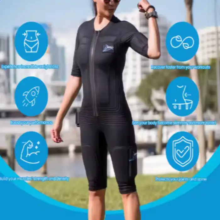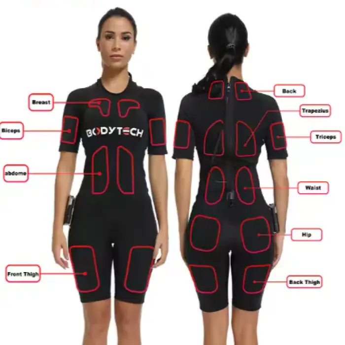 The package includes the EMS fitness machine and a comfortable training suit made of spandex and cotton.