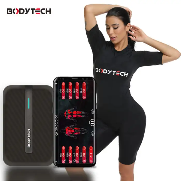 The EMS Smart Body Device is a low and medium frequency electrical muscle stimulation unit designed to help improve muscle tone, reduce cellulite, and assist with weight loss using patented dry electrodes for a comfortable experience.