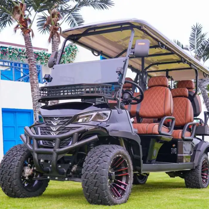 This electric golf cart can comfortably seat up to 6 passengers.