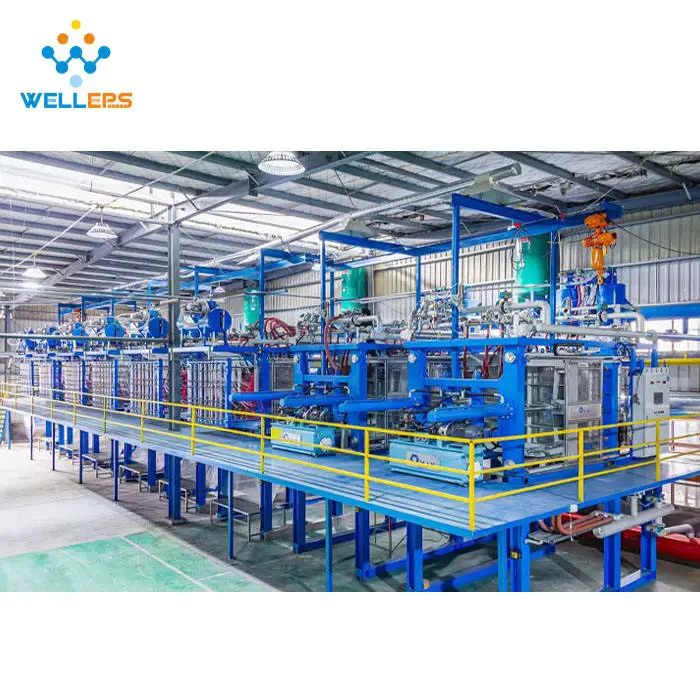 The machine is designed to work with EPS (expanded polystyrene) materials for foam slab production.