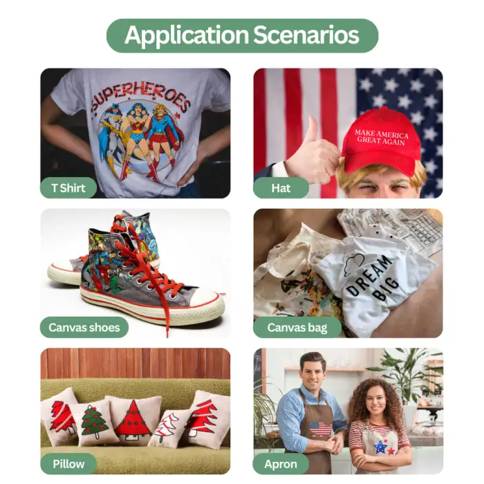Applications include printing custom designs on T-shirts, creating promotional textiles, designing personalized gifts, producing fashion samples, and offering print services for events.