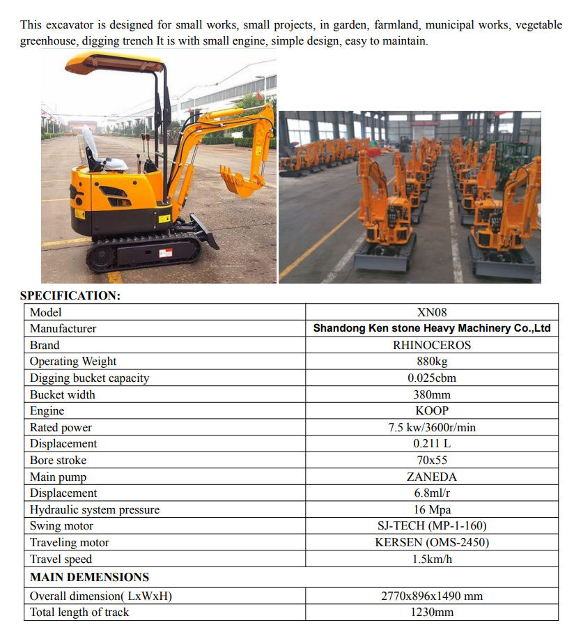 The Excavator XN08 has a compact design, weighing approximately 800 kg, making it suitable for various construction and landscaping projects.