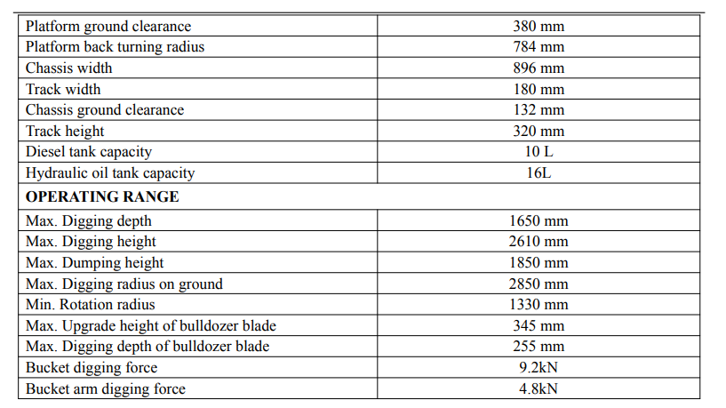 The Excavator XN08 features a compact size with dimensions of approximately 3.2 meters in length, 1.4 meters in width, and a height of 2.3 meters.