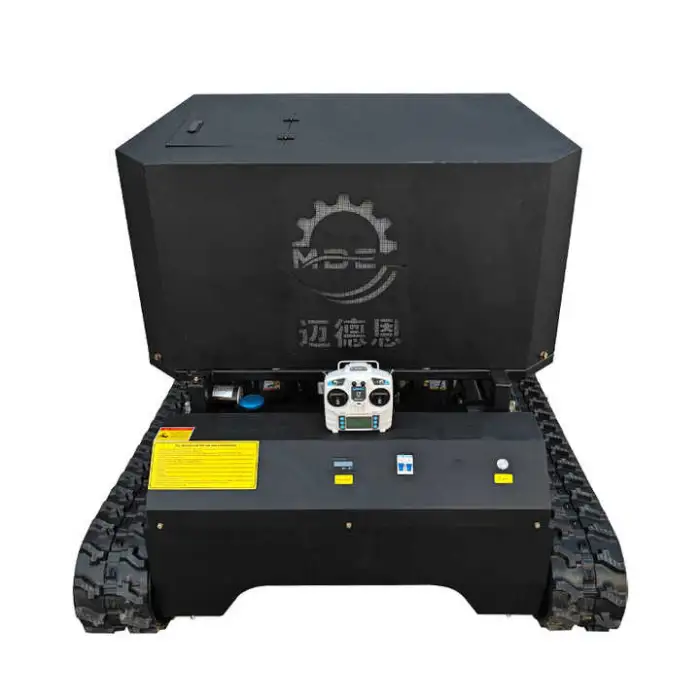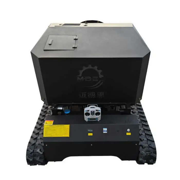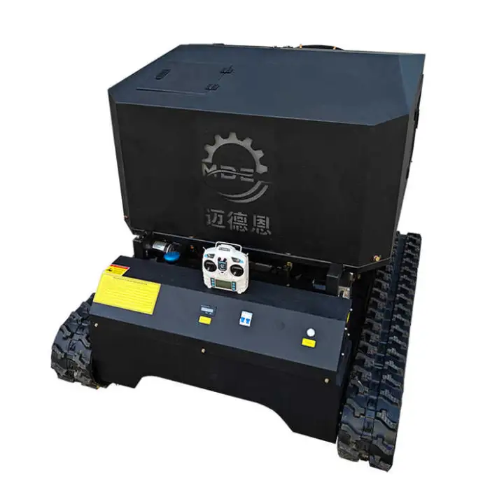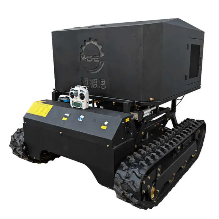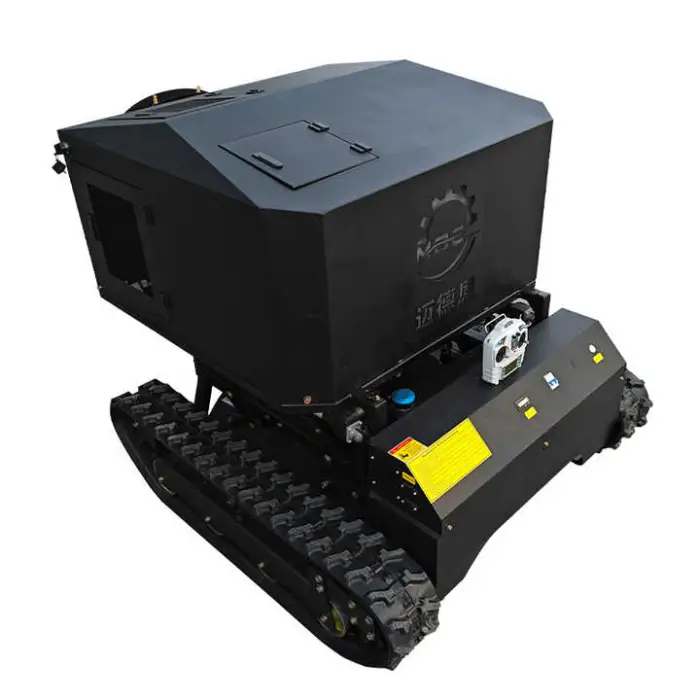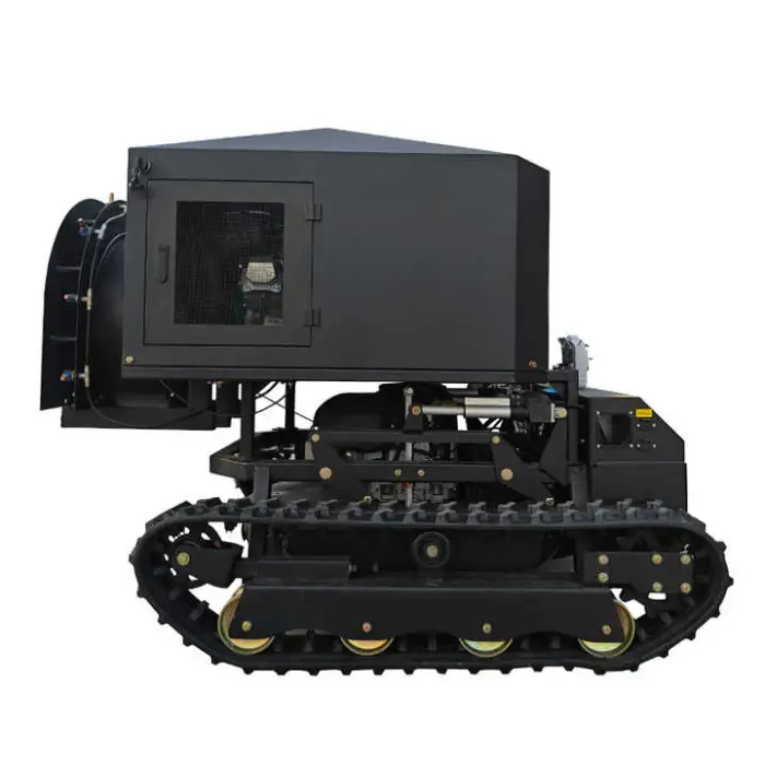 A multi-function, self-propelled gasoline lawn mower with crawler/track capability and remote-control operation, designed for mowing and orchard spraying on uneven and large outdoor areas.