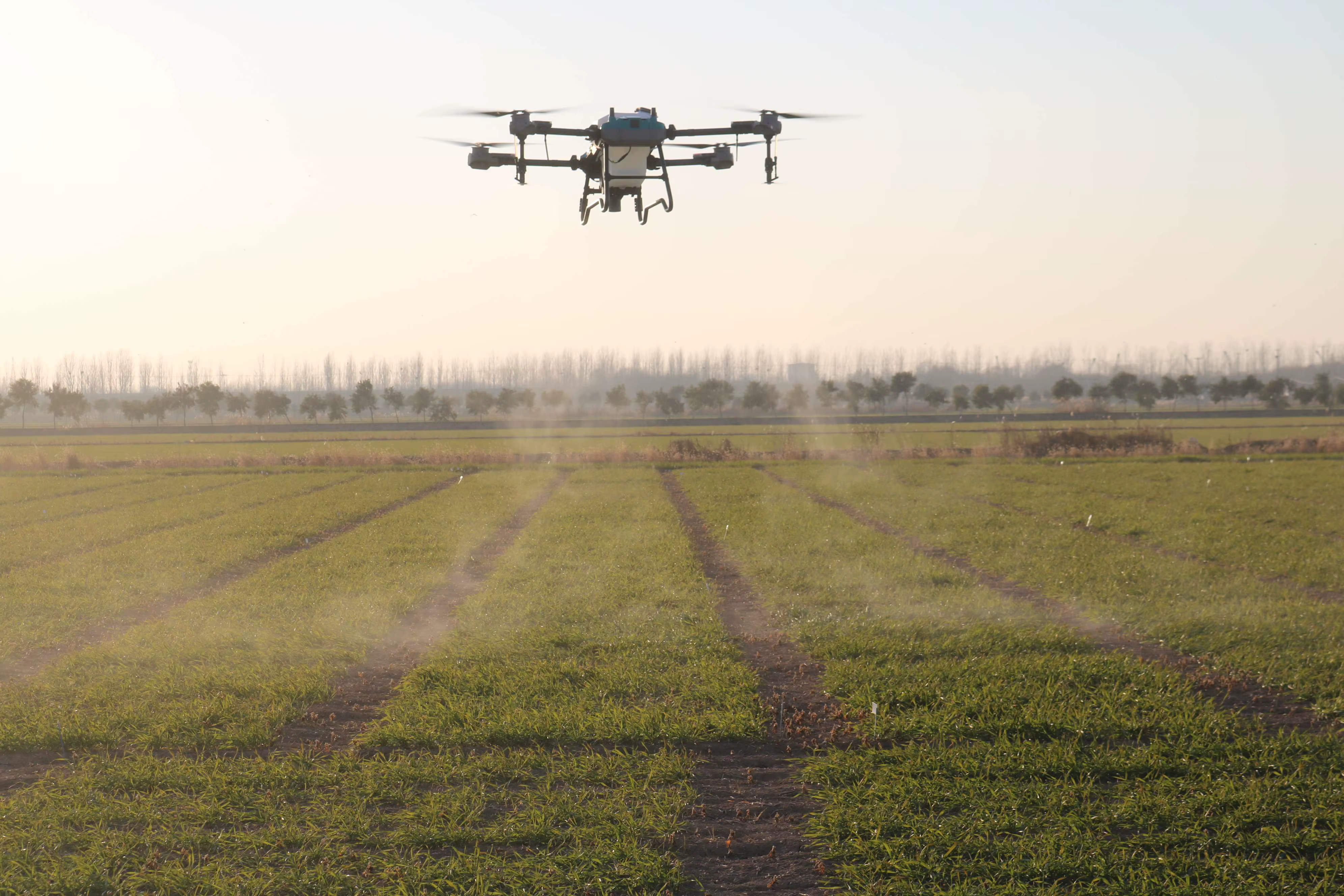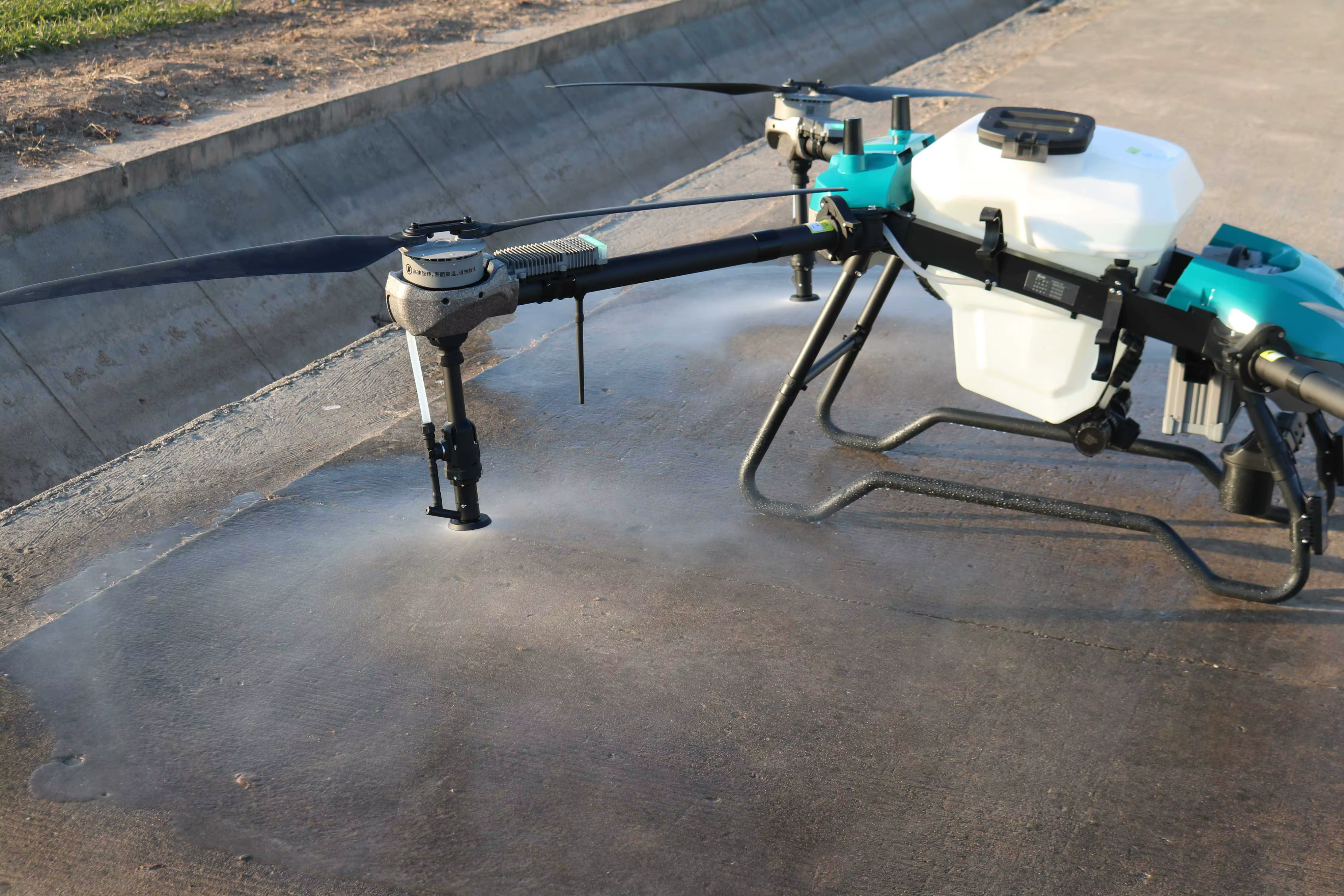 The drone uses an Unmanned Aerial Vehicle (UAV) sprayer type, designed for precision application of pesticides and fertilizers.