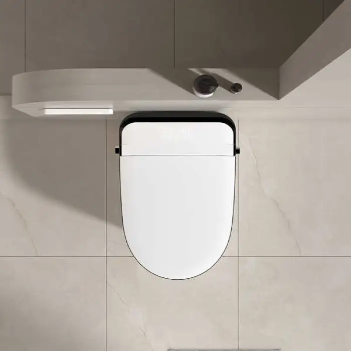 The toilet seat is made of high-quality ceramic, ensuring durability and a modern aesthetic.
