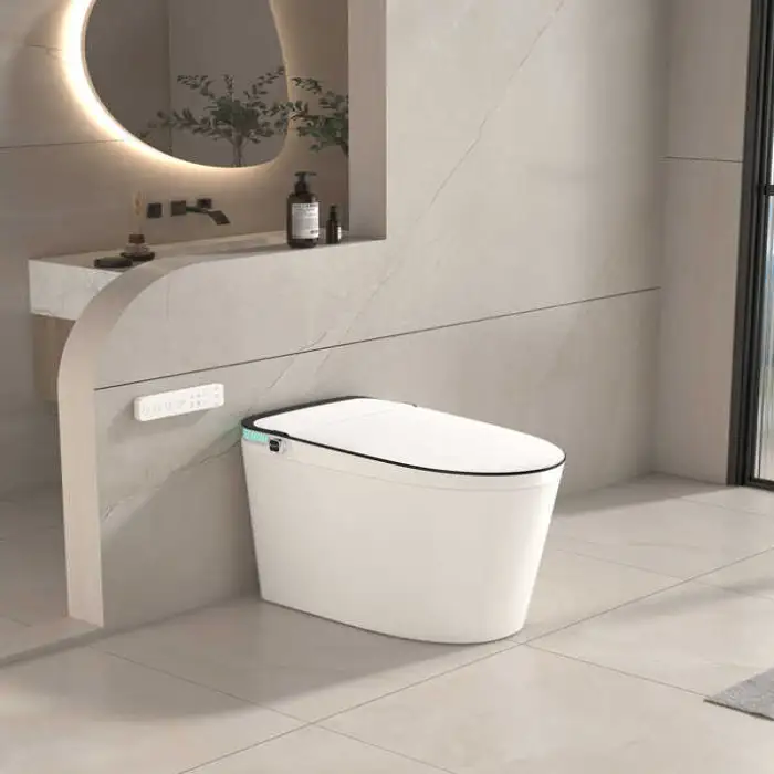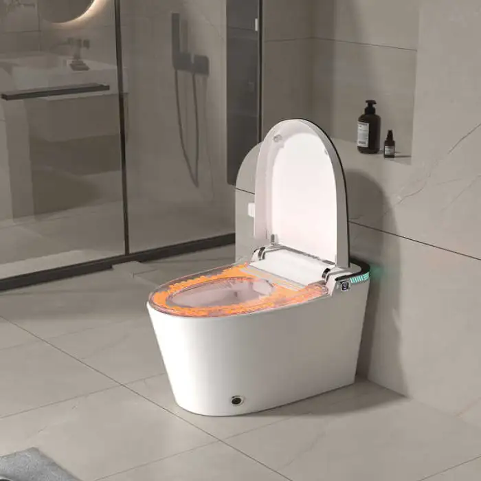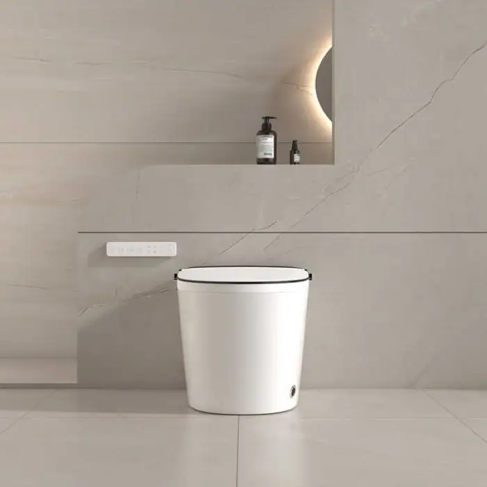 The FEIDU Modern Smart Toilet Seat features a heated seat, remote control for easy adjustments, a self-cleaning nozzle, warm air drying, and an elongated design that fits most standard bathrooms.