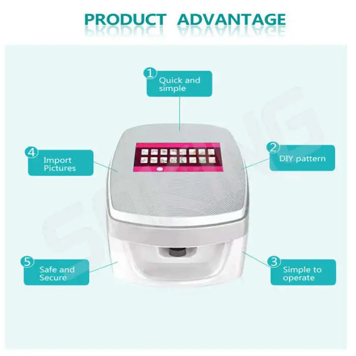 The CE Five Fingers Digital Photo Nail Art Printer is an innovative device that allows users to create and print beautiful nail designs at home using a 7-inch touch screen.