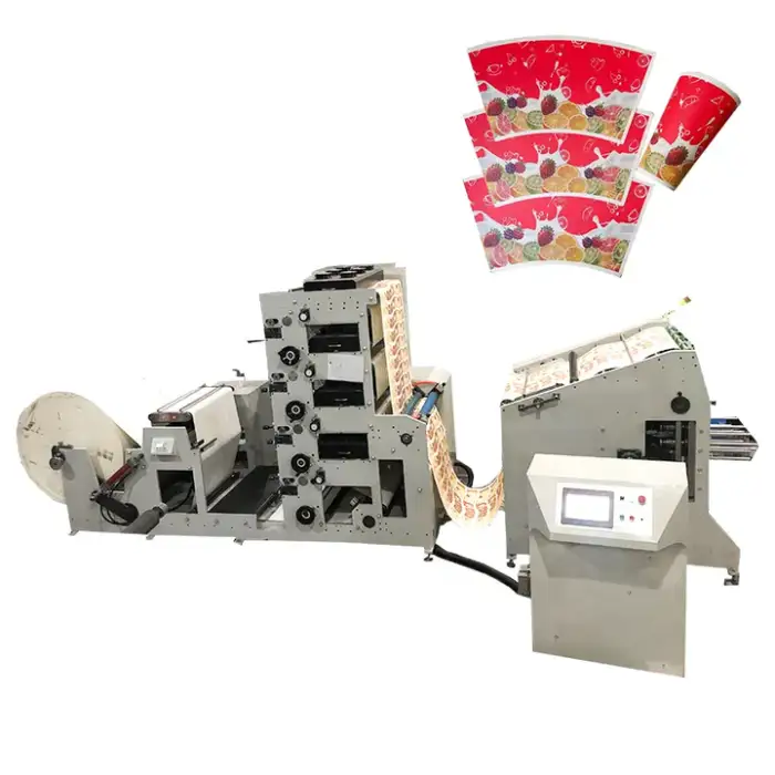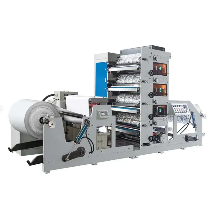 It is a 4-color flexographic printing machine, enabling CMYK-style or four-color process/vibrant spot color printing using flexo technology.