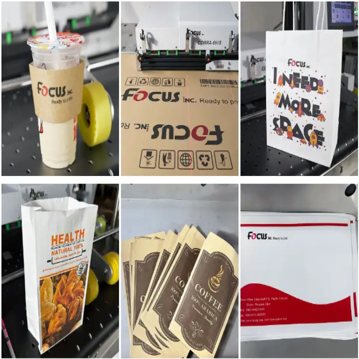 The FocusInc Paper Bag Package Machine can print on various materials including paper bags, boxes, banners, card stock, fabric, and shopping bags.