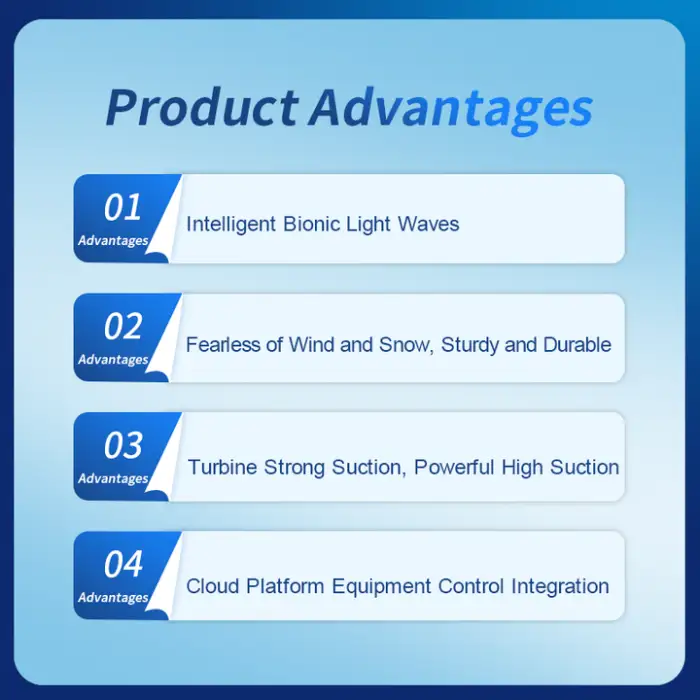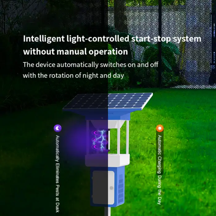 The device uses high-efficiency wind suction to capture and eliminate insects, providing effective pest control.