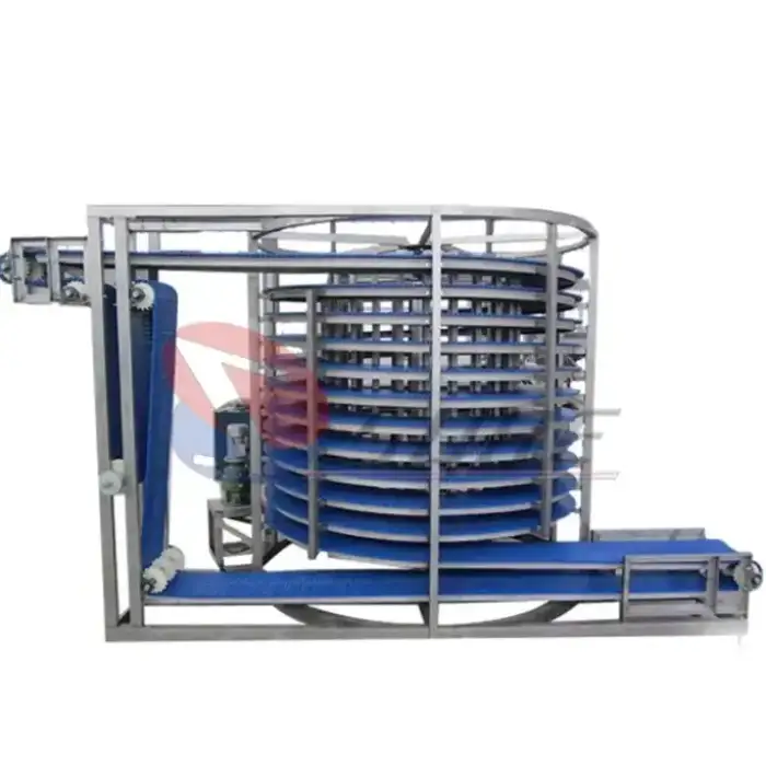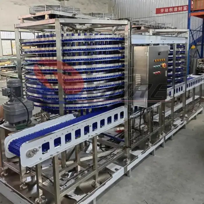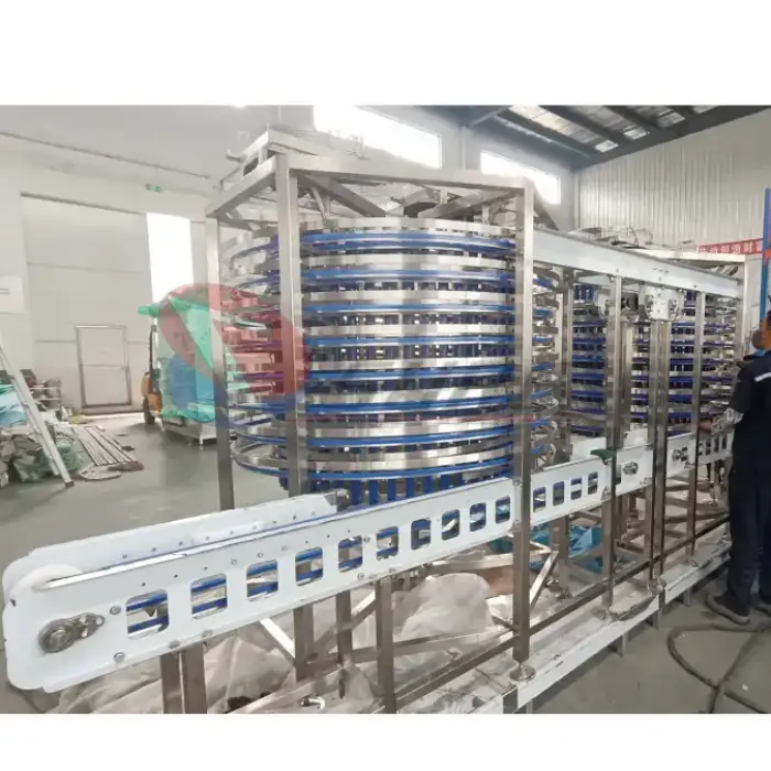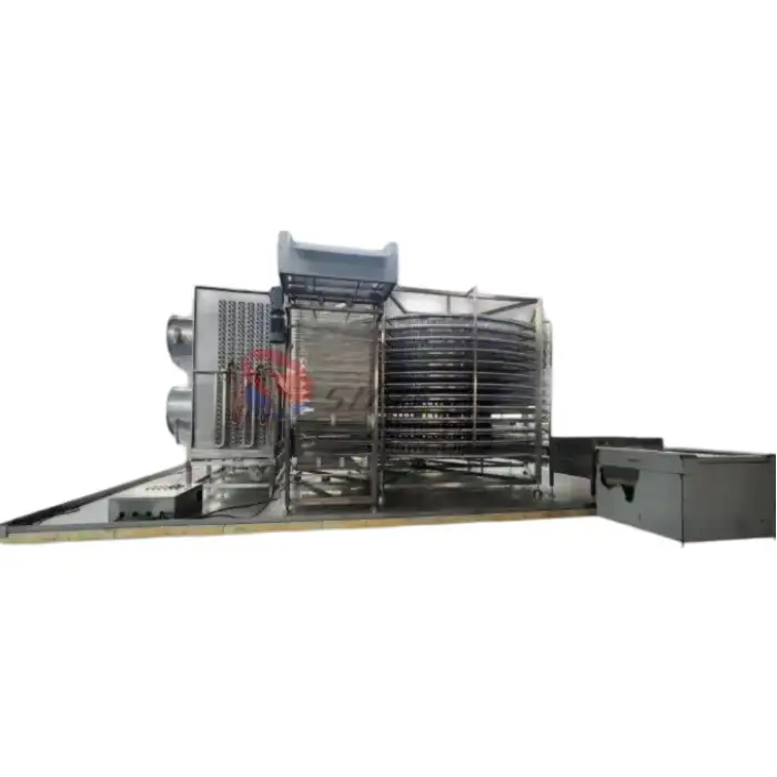 The spiral design maximizes space efficiency and allows for continuous freezing of seafood products on a conveyor system, ensuring uniform freezing and optimal use of floor space.