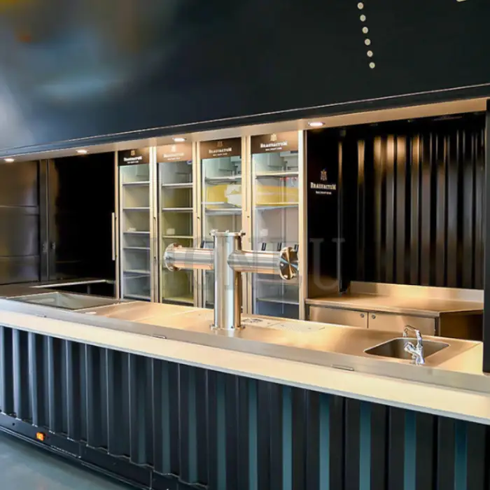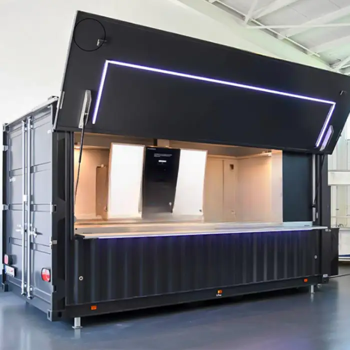 Standard sizes listed are 400 cm (about 13 ft) and 500 cm (about 16.4 ft). The product is marketed as a 20 ft shipping container restaurant as well — longer or custom lengths and layouts can be produced on request, so confirm available sizes with the supplier.