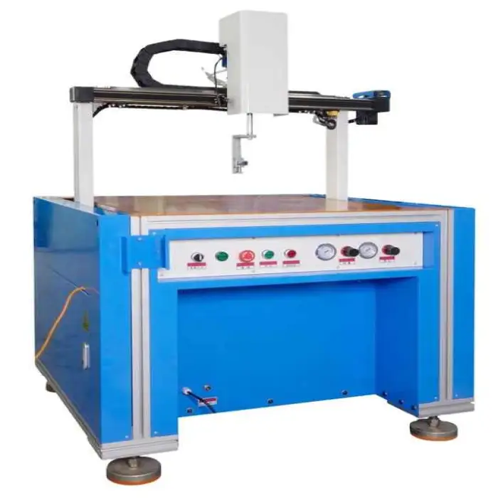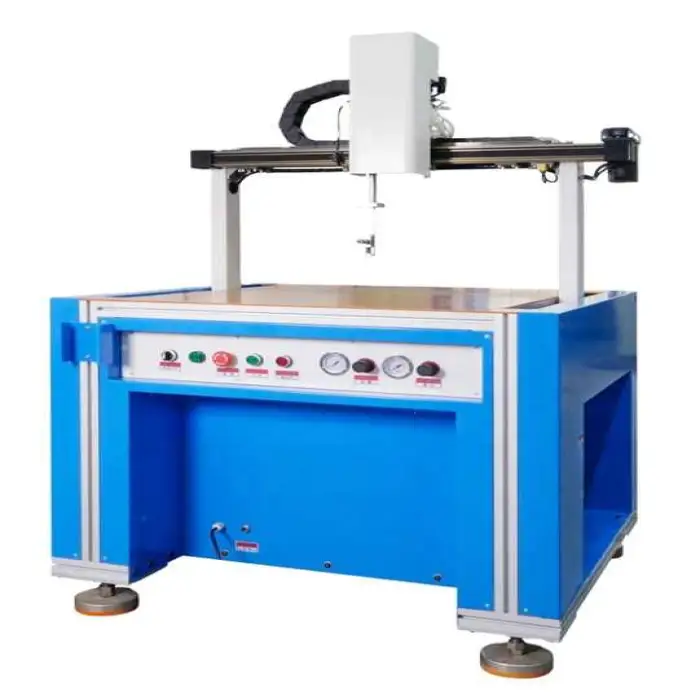 This machine is suitable for various industries including leather goods manufacturing, packaging, electronics assembly, filter production, and photo frame assembly.