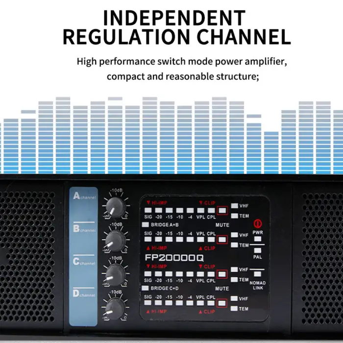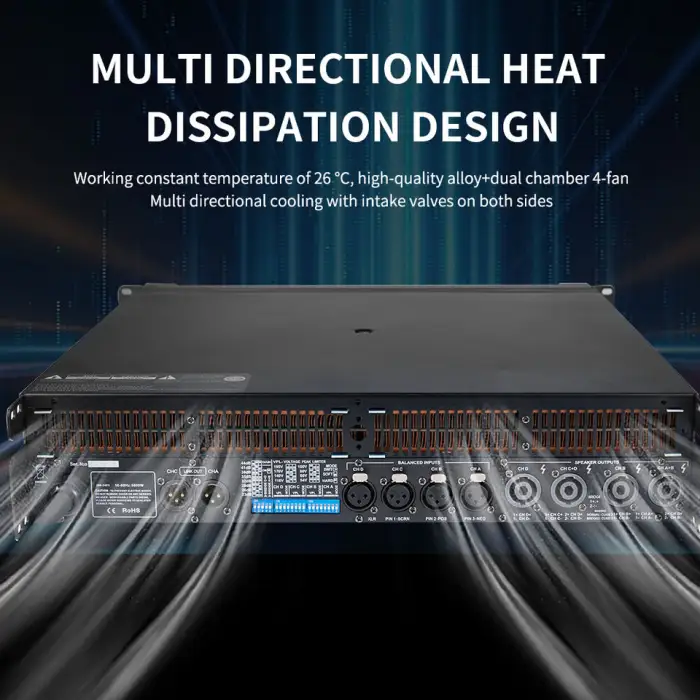 The FP22000 amplifier uses advanced Gallium Nitride Class D technology for high efficiency and powerful audio performance.
