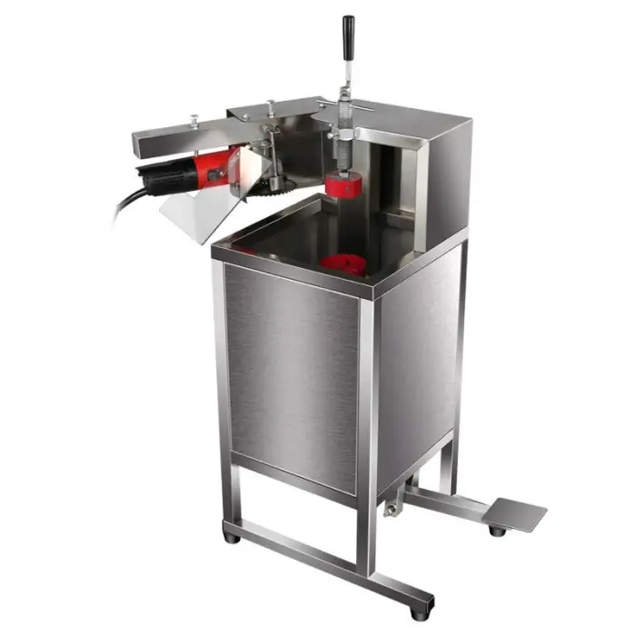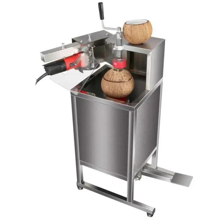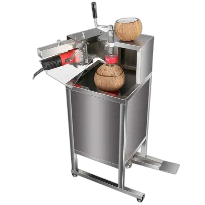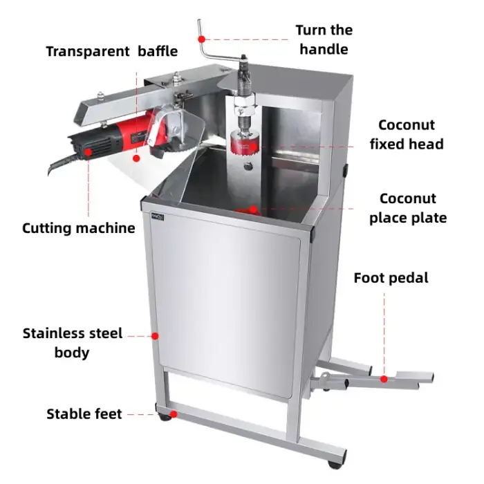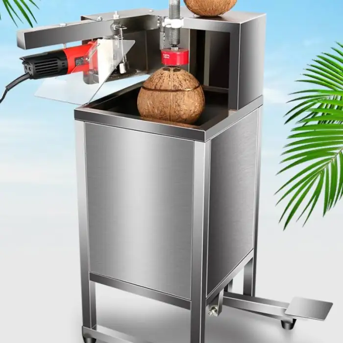 It quickly and safely cuts open green (young) coconuts to access coconut water and meat, designed for high-efficiency commercial use.