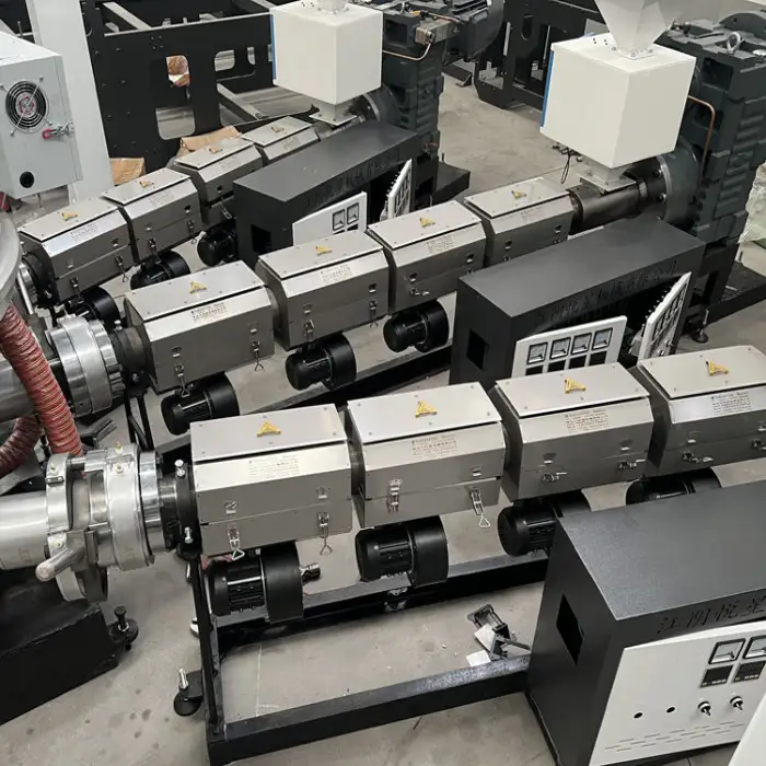Yes, it includes an automatic double winder for easy handling and a fast screen changer for efficient production.