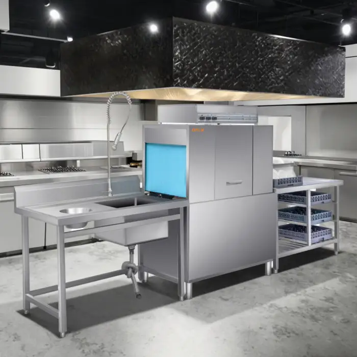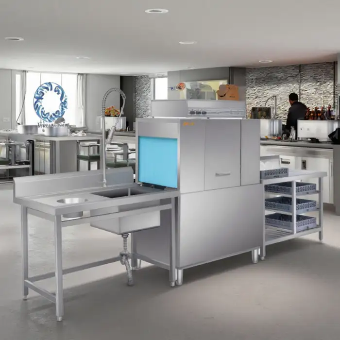 The Fully Automatic Commercial Kitchen Equipment Rack Type Dishwasher can clean up to 200 racks per hour.