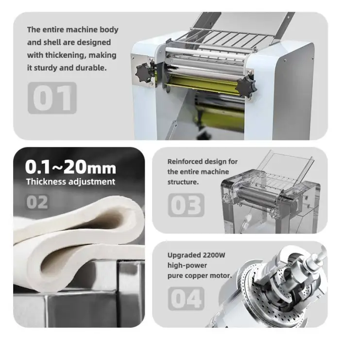 The dough sheeter can be used for making pizza dough in bakeries, quick dough preparation in restaurants, and large-scale dough production in food processing plants.