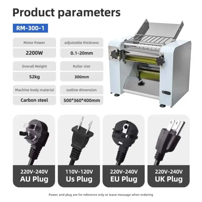 The Fully Automatic Electric Pizza Dough Sheeter is available in voltage options of 220V, 240V, and 380V.