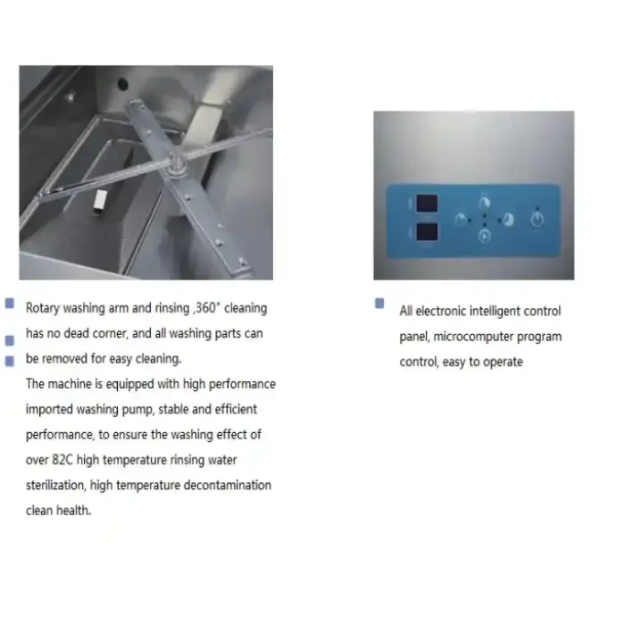 The dishwasher features a user-friendly control panel that allows staff to easily set wash cycles, monitor progress, and adjust settings with minimal training required.